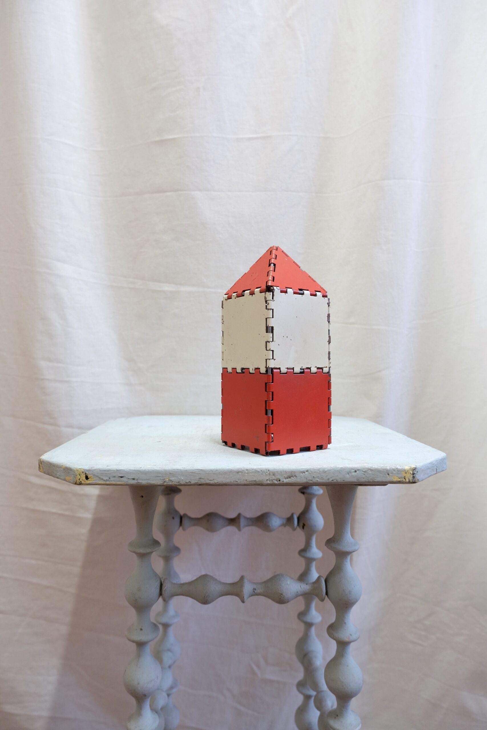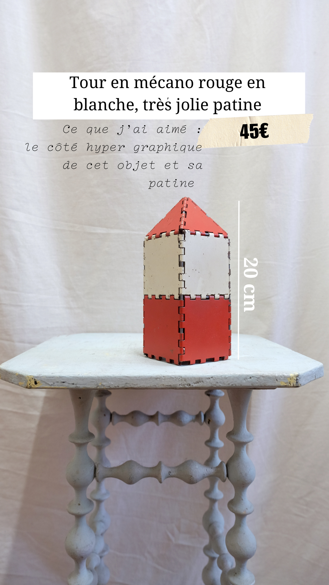 Jeu en métal, comme un mécano ancien, rouge et blanc. Sera très chouette en déco sur une bibliothèque. Très belle patine.