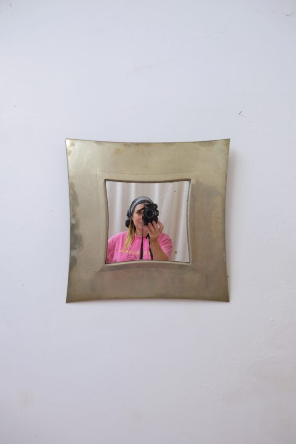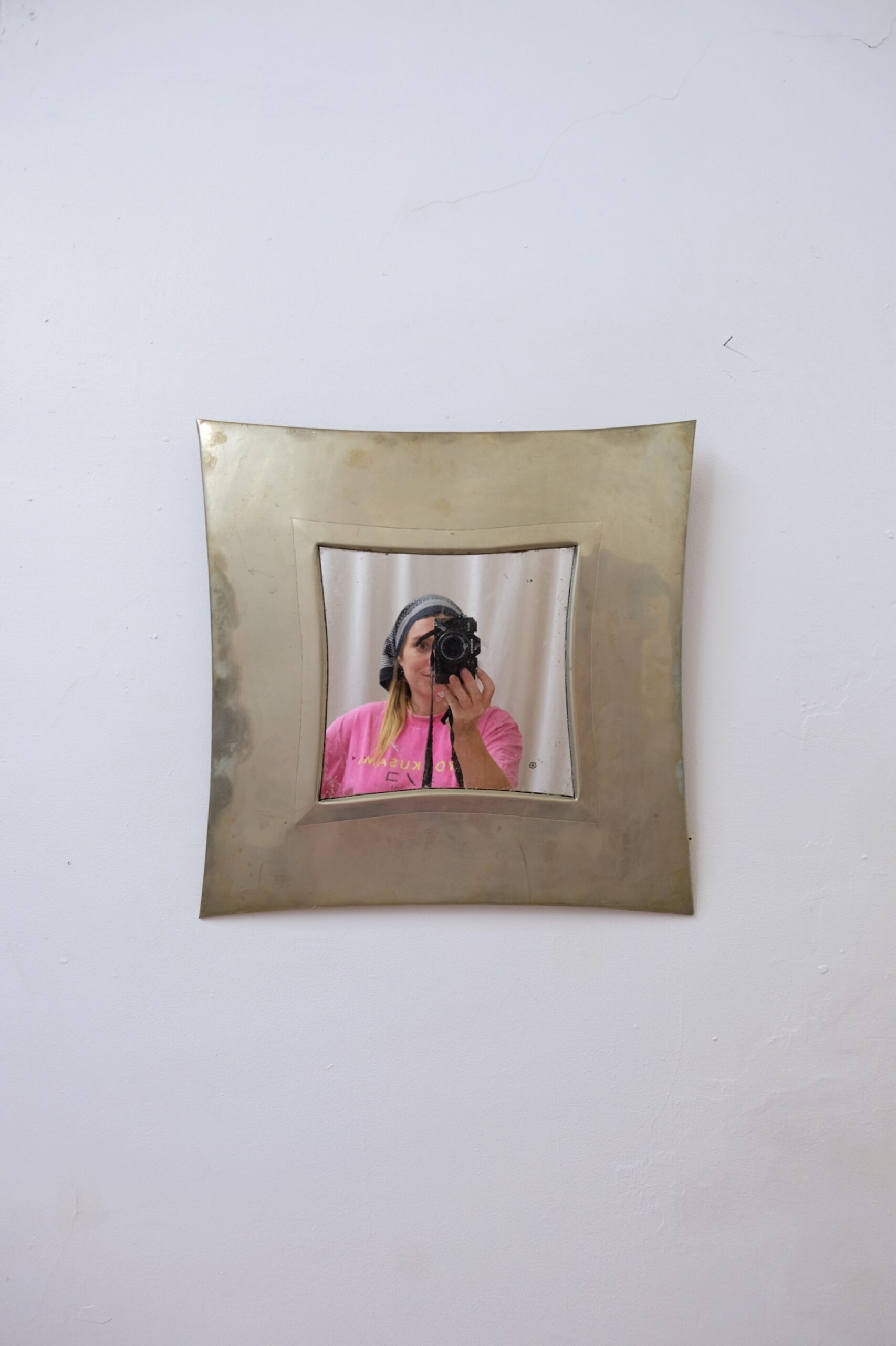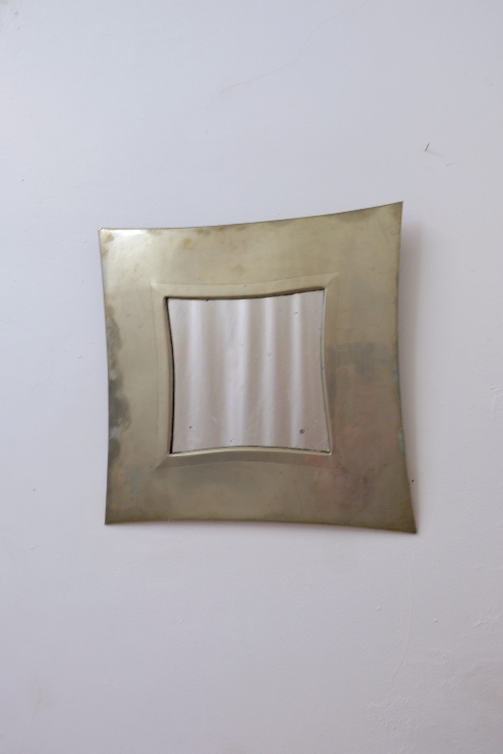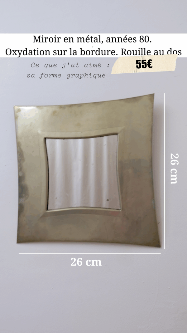 Miroir en métal à la forme géométrique typique des années 80. Importantes traces d’oxydation. Rouille au dos.